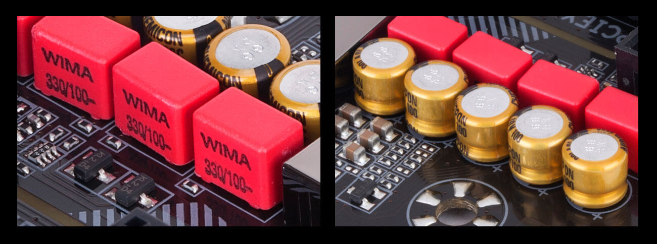 신제품 AORUS Z370 시리즈 메인보드는 WIMA Hi-Fi FKP2 수준의 오디오 커패시터를 채용한다. 특히 Fine Gold 하이엔드 오디오 전용 커패시터는 첨단 기술을 사용하여, 묵직한 중저음과 깨끗한 고주파수 오디오를 표현하여 오디오 품질이 훨씬 풍성해졌다. 특히 WIMA FKP2 오디오 커패시터는 고급 Hi-Fi 오디오 시스템에 사용되는 컴포넌트라는 점을 지적할 만하다. 고품질 컴포넌트에 AMP-UP Audio 기술을 탑재하여, 최고의 오디오를 추구하는 매니아층 사용자들에게 완벽한 오디오 솔루션을 제공한다.