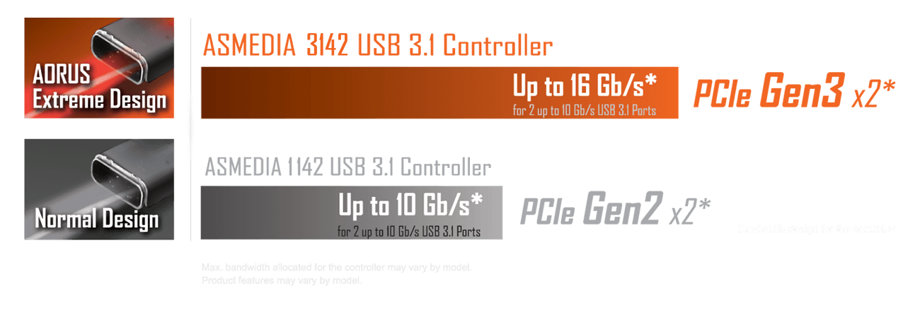 ASMEDIA 3142 콘트롤러는 PCIe Gen3 x2 레인을 채택, 최대 전송 주파수가 16Gb/s으로, USB 3.1에 10Gb/s 주파수를 용이하게 공급하여, 다른 전송 주파수가 10Gb/s인 USB 3.1 솔루션에 비해 ASMEDIA 3142 콘트롤러는 성능면에서 우월한 강점을 갖고 있다. 기존의 USB와 비교해보면, USB 3.1은 2배의 전송 주파수를 제공할 뿐만 아니라 USB 2.0 및 USB 3.0과도 양방향 호환된다. 특히 USB 3.1은 무방향성의 최신 기술을 보유한 USB Type-C™ 포트와 보통의 Standard-A 커넥터와 호환되어 외장형 장치를 훨씬 간편하게 사용하여 응용 범위가 광범위하다는 점을 주목해야 한다.