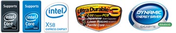 | "Ultra Durable 3 Technology, features 2 oz copper PCB, Hybrid Silent Pipe 2 System, supports multi-card interface, matches the advanced hardware support and expandability, it becomes the king of the X58 motherboard market without a doubt. Based on the excellent design of GIGABYTE EX58-Extreme motherboard, it wins the optimum design award from the INTO evaluation group." |