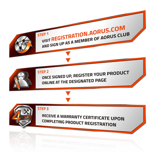 Doświadczaj tego co najlepsze z AORUS. Dlatego, oprócz standardowej 3-letniej gwarancji, chcielibyśmy zaoferować ci dodatkowo 1 rok ochrony AORUS Care na kartę graficzną AORUS - bezpłatnie. Zarejestruj się na stronie AORUS, aby uzyskać 4 lata gwarancji.