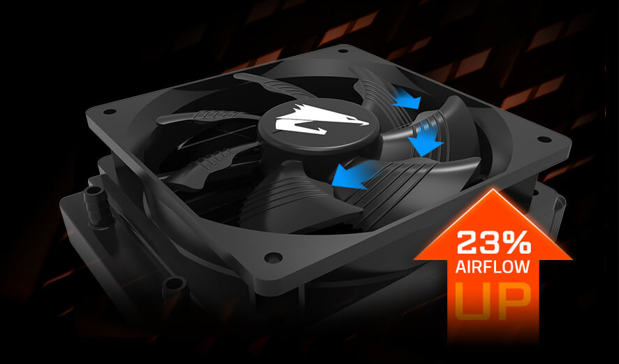 The 120mm dynamic adjusting fan provides the silent operation. The airflow is spilt by the triangle fan edge, and guided smoothly through the 3D stripe curve on the fan surface, effectively enhancing the airflow by 23% over the traditional fans.