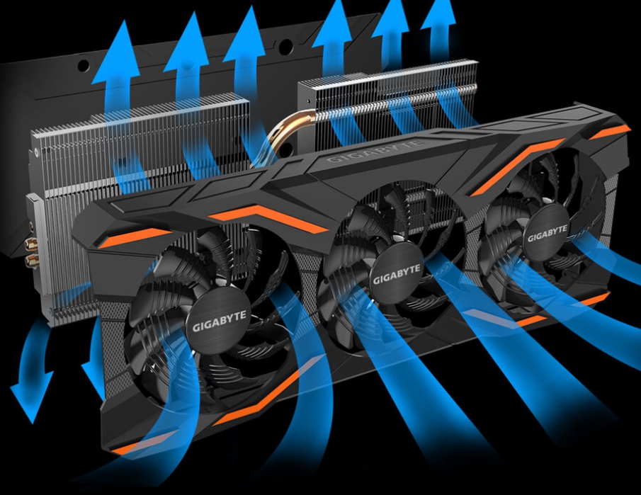 WINDFORCE 3X rashladni sistem poseduje 3 bakarne kompozitne vruće cevi, specijalno dizajnirana rebra kulera, jedinstven dizajn peraja ventilatora, koji zajedno isporučuju efektivnu disipaciju toplote za više performanse na nižim temperaturama.