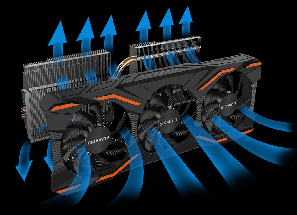 WINDFORCE 3X rashladni sistem poseduje 3 bakarne kompozitne vruće cevi, specijalno dizajnirana rebra kulera, jedinstven dizajn peraja ventilatora, koji zajedno isporučuju efektivnu disipaciju toplote za više performanse na nižim temperaturama.