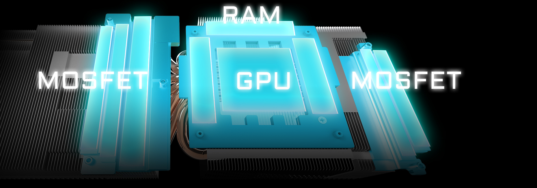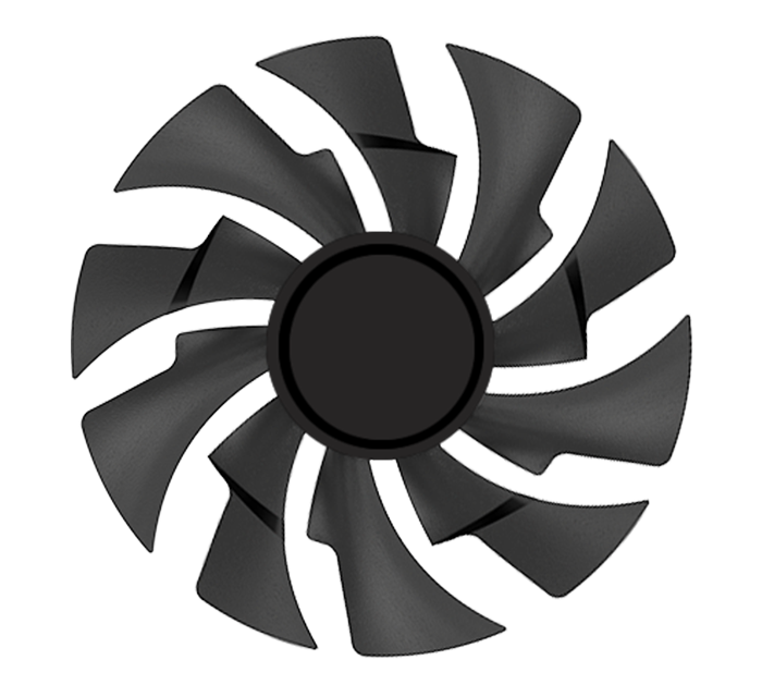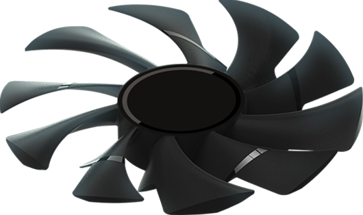 Три работающих в стеке 100-мм вентилятора накрывают большую часть поверхности радиатора и способны организовать оптимальное распределение потоков, эффективно охлаждая все ключевые зоны. В отличие от решения на базе трех типовых вентиляторов, вентиляторы стека WINDFORCE обеспечивают наилучшие параметры охлаждения.