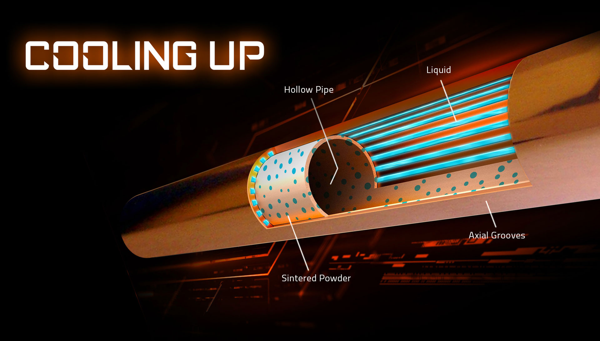 Основу конструктива системы охлаждения составляет выполненный из алюминиевого сплава радиатор с тепловыми трубками и медной вставкой, которая соприкасается непосредственно с кристаллом ГП. Эффективное охлаждение видеоОЗУ реализовано средствами металлической пластины значительных размеров, которая через термопрокладки примыкает к микросхемам памяти.