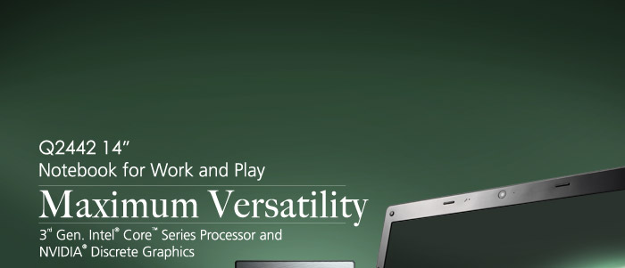 The 14” GIGABYTE Q2442 comes with Genuine Windows® 7 Home Premium or Genuine Windows® 7 Professional. The notebook is powered by a 3rd generation Intel® Core™ Series processor, providing faster and smarter computing performance that is great for multitasking. With excellent features, the Q2442 satisfies all needs for work and play.