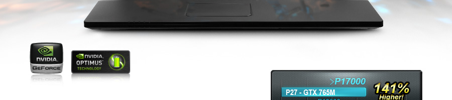 Features a high-end NVIDIA® GeForce® GTX 765M GDDR5 2GB graphics processor that supports NVIDIA® Optimus™, NVIDIA® PhysX™ and DirectX11 Technology! The P27K delivers an ultimate gaming experience even for the most heavy games. Enjoy unrivaled power with an impressive score exceeding P17, 000 on 3DMark Vantage!