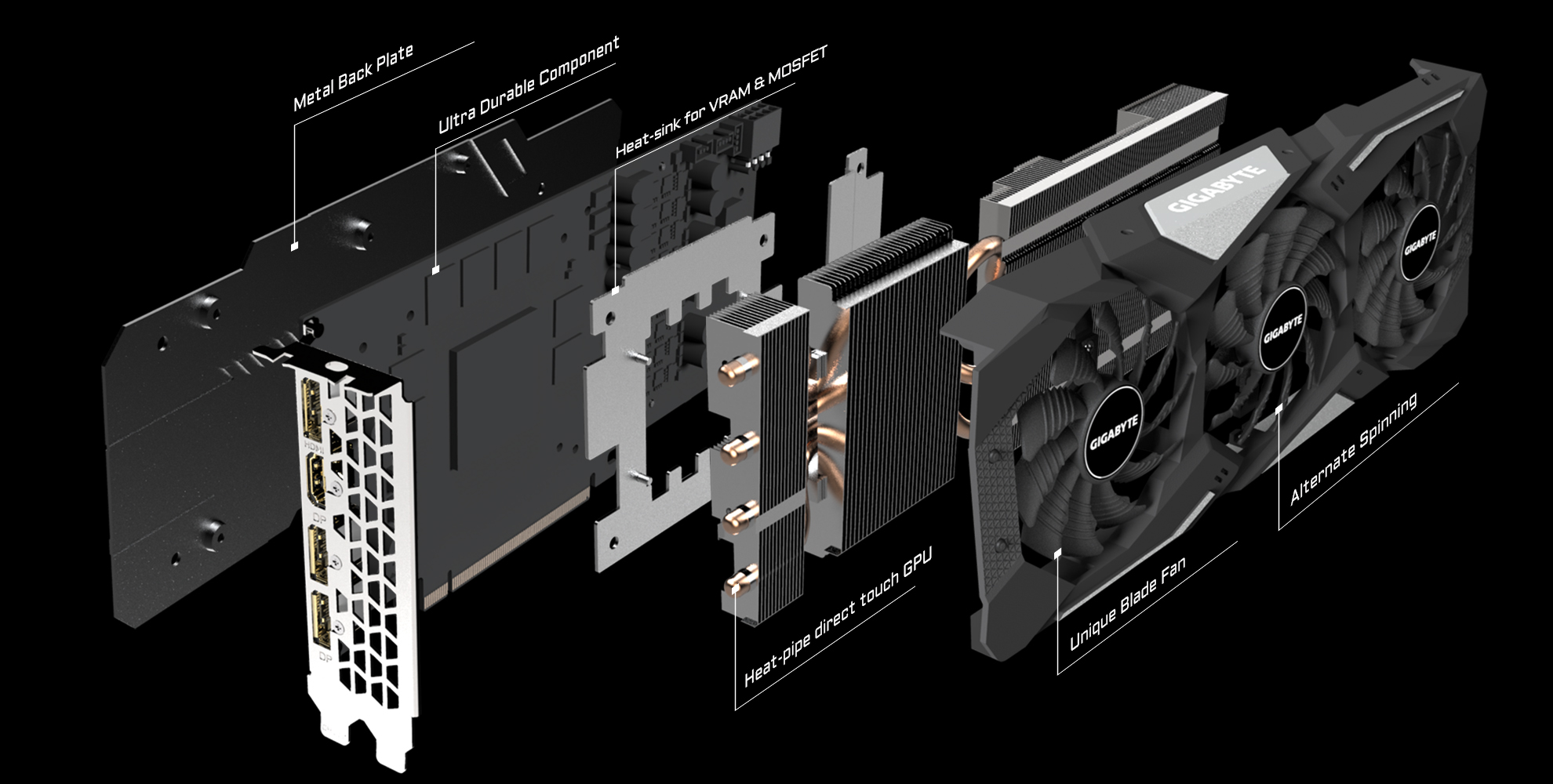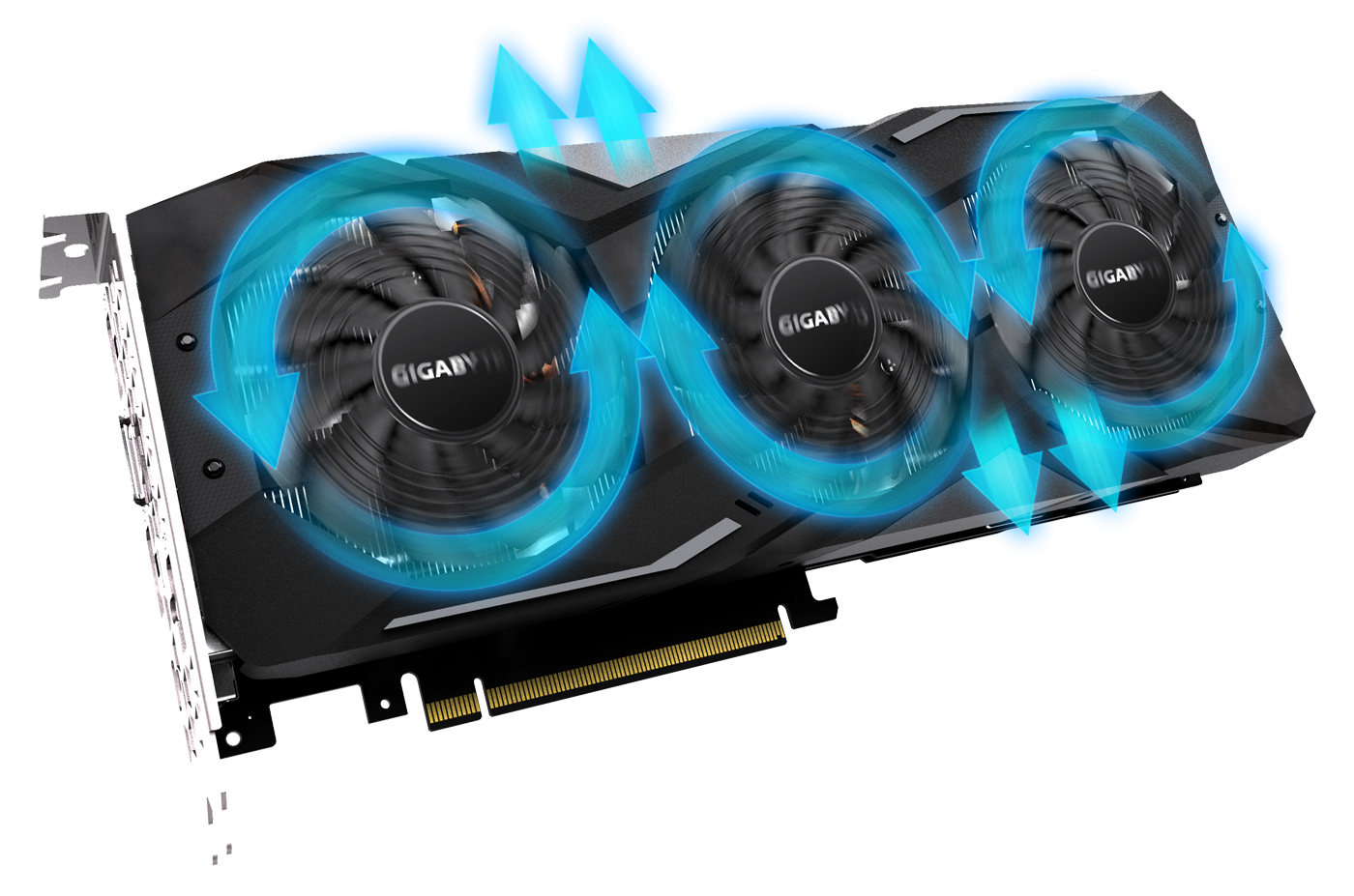 GIGABYTE "Alternační spinning" je jediným riešením, ktoré si dokáže poradiť s turbulentným prúdom vzduchu z trojice ventilátorov. Najväčším problémom v prípade použitia trojice ventilátorov sú totiž turbolencie. Vzhľadom k tomu, že sa ventilátory otáčajú rovnakým smerom, je smer prúdenia vzduchu medzi ventilátormi opačný, čo spôsobuje turbolentné prúdenie vzduchu a znižuje účinnosť odvodu tepla. GIGABYTE otáča chod stredného ventilátora do opačného smeru, takže smer prúdenia vzduchu medzi oboma ventilátory je rovnaký, čo znižuje turbolencie a zvyšuje tlak vzduchu.