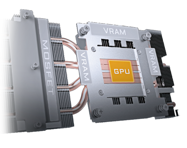 Tvar medených heat pipe trubíc maximizuje priamu kontaktnú plochu s GPU, čím zvyšuje účinný prenos tepla. Heat pipe trubice taktiež odvádzajú teplo z VRAM časti s pomocou veľkej čiernej platne.