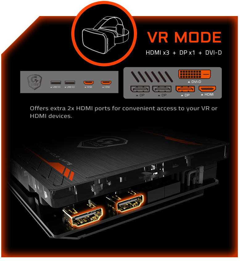 Xtreme VR Link provides the best solution for both VR device demand with 3 HDMI ports and 3x 4k monitors demand with 3 DP ports. Outputs are automatically detected when restarting PC.