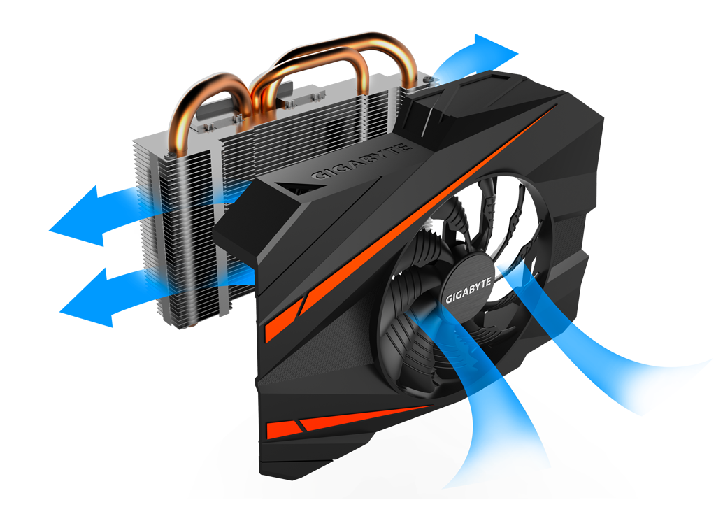 The GIGABYTE Custom-designed cooling system features a 90mm fan, 3 pure copper composite heat-pipes, unique blade fan design, heat pipes direct touch technology together delivering an effective heat dissipation capacity for higher performance at lower temperatures.