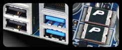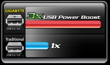 3x USB Power Boost จาก GIGABYTE ได้รับการออกแบบมาสำหรับเพิ่มพูนเสถียรภาพให้กับอุปกรณ์ USB. มีความเข้ากันได้กับอุปกรณ์ USB ทุกรุ่น ทุกแบบ ไม่ว่าจะเป็นฮาร์ดไดร์ฟ หรือออฟติคอลไดร์ฟแบบติดตั้งภายนอก ซึ่งด้วยนวัตกรรมนี้ จะช่วยให้การส่งมอบพลังงานผ่านพอร์ต USB มีประสิทธิภาพมากยิ่งขึ้น สามารถจ่ายพลังงานได้อย่างเพียงพอด้วย USB เพียงพอร์ตเดียว. ส่งผลให้ผู้ใช้งานสามารถเชื่อมต่ออุปกรณ์ USB ได้มากขึ้น