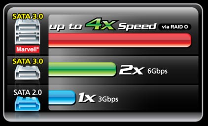 ให้ประสิทธิภาพสูงสุดเมื่อติดตั้งฮาร์ดไดร์ฟในแบบเป็นคู่ผ่าน SATA Revision 3.0 (SATA 6Gbps) จาก Marvell®, มาตรฐานใหม่ของอินเตอร์เฟสการจัดเก็บข้อมูลความเร็วสูง. หากมีการทำงานบนโหมด RAID 0 (Stripe) mode ผ่าน SATA Revision 3.0 จะทำให้ระบบมีประสิทธิภาพในการโอนถ่ายข้อมูลสูงมากขึ้นเป็น 4 เท่า เมื่อเปรียบเทียบกับ SATA Revision 2.0