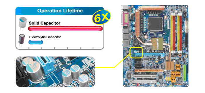 Generating less heat then their electrolyte counterparts, solid capacitors last on average 6 times longer, helping to ensure your system never quits. Additionally, solid capacitors have a higher tolerance not only for higher temperatures, but they also perform better with higher frequencies and higher current than electrolytic capacitors. The excellent heat resistance and better electric conductivity allows enthusiasts to tweak the highest levels of performance from their system without fear of excessive capacitor wear or exploding capacitors. Adopting an all solid capacitor design helps explain why GIGABYTE Ultra Durable motherboards are the most stable, reliable and most overclocking-friendly motherboards on the market today. |