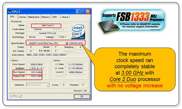 The main feature that GIGABYTE rev 3.3 motherboards provide is that they offer support for the next generation 1333 FSB Intel Core™ 2 Duo processors. As 1333MHz FSB is natively supported, no overclocking is need to unlock the performance benefits of these new processors.