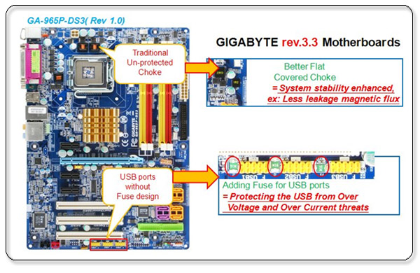 For the rev 3.3 motherboards, GIGABYTE has used higher quality covered flat chokes. Not only does this protect the chokes from damage, but it also protects the other surrounding components on the motherboard from magnetic flux leakage from the choke, thereby enhancing the stability of the motherboard.
