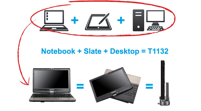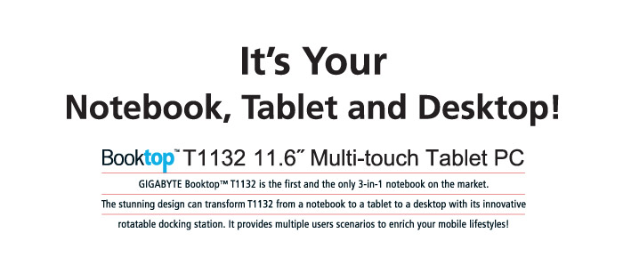 Capacitive Multi-touch Tablet NotebookThe rotatable multi-touch screen provides intuitive user experience and the dynamic swivel panel can convert T1132 into a tablet mode within a second. The tablet functionality is excellent for both work and play. |