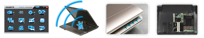 Smart Manager Control CenterSmart Manager user interface consolidates different system programs into one single intuitive guiding page, which makes personal setting just a click away. High Speed Mobile Broadband Support (Optional)With 3.5G support to access high-speed internet anytime anywhere. This allows getting online, without worrying about Wi-Fi hotspots! Quick Battery Status CheckThe innovative quick battery status check lets you see how much battery power is remaining when the notebook is off. Simply click on the right mouse button and the LED lights will light up to indicate how much battery power is remaining. Easy Upgrade for HDD and MemoryWhen the need for more storage space or higher memory capacity arises, the special modularized-design allows quick and easy hassle-free upgrading. |