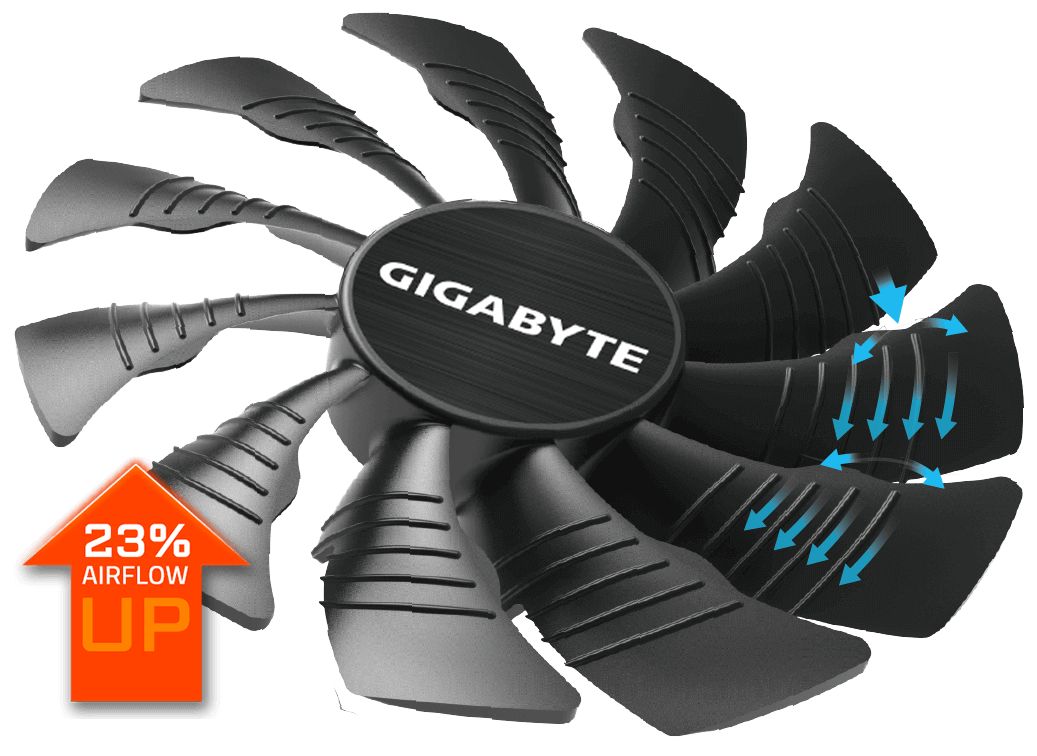 WINDFORCE 2X soğutma sistemi, 3 saf bakır kompozit ısı borusu, ısı borusu doğrudan temaslı GPU, 90 mm benzersiz blade fan tasarımı, LED göstergeli 3D aktif fan, şık metal arka plaka, ve daha düşük sıcaklıklar ile birlikte daha yüksek performans için etkili bir ısı dağılımı kapasitesi sunar.