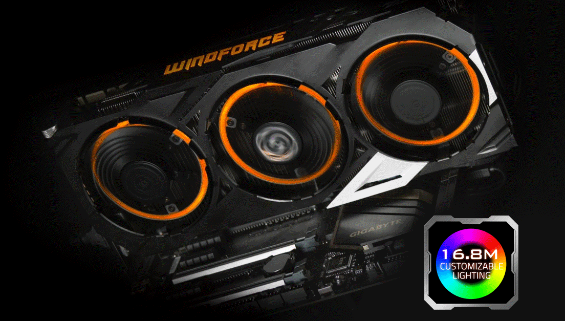 顯示卡上WINDFORCE標誌及三道風扇炫彩光纖燈具備1680萬色真實多彩的燈光效果,玩家可以透過技嘉OC GURU II超頻軟體自由調整燈光顏色和各種特效,打造自我專屬風格的PC視覺造型