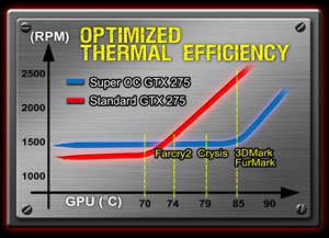 技嘉GTX 275 與 GTX 260Super Overclock系列顯示卡於呈現高畫質3D影像,複雜高度擬真的物理運算時,還可確保風扇轉速在1500 rpm以下