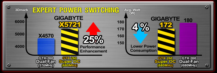 歷經金手套GPU Gauntlet™ Sorting技術焠鍊,技嘉GTX 260 Super Overclock超頻版顯示卡保證以更低功耗(4%),超頻效能亦能超越一般市售超頻版
