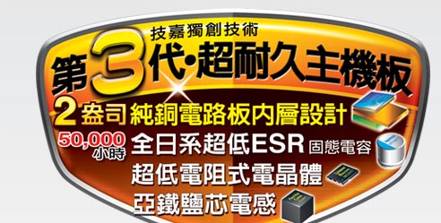 技嘉科技延續「第二代超耐久技術」品質至上的產品設計理念,2008年再度以創新科技領先業界,推出「第三代超耐久主機板」,證明技嘉科技對主機板設計的嚴苛要求及對品質的絕對保證。第三代超耐久技術首創桌上型主機板採用2盎司純銅電路板設計,此創新的設計概念就是在印刷電路板 (PCB) 的電源層 (Power Layer) 與接地層(Ground Layer) 採用2盎司純銅設計,協助主機板更迅速地降低運作溫度,增加電源效率而且能夠讓超頻後的系統更加穩定。