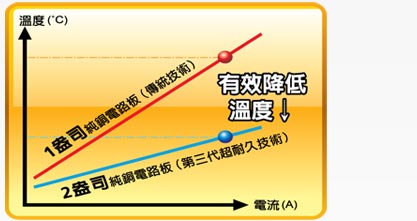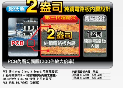 在主機板超薄的電路板電源層裡加入2盎司純銅可以增加電流傳輸並減少阻抗,電源交換效率提升且減少電源耗損,也能降低廢熱產生,使電路板溫度更低。