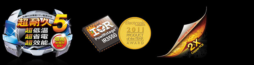 技嘉第五代超耐久™ 主機板,使用 IR3550 PowIRstage® 晶片,內建業界最高60安培的超高耐電流能力,並具有更低電源損耗、絕佳電源效率和出色的散熱管理。