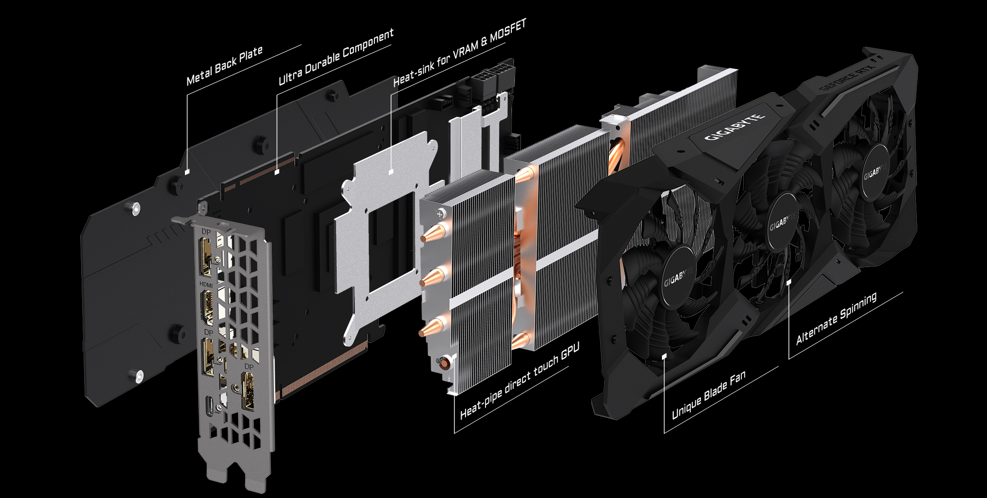 The WINDFORCE 3X cooling system features 3x 80mm unique blade fans, alternate spinning fan, 6 composite copper heat pipes, heat-pipe direct touch and 3D active fan functionality, together delivering an effective heat dissipation capacity for higher performance at lower temperatures.