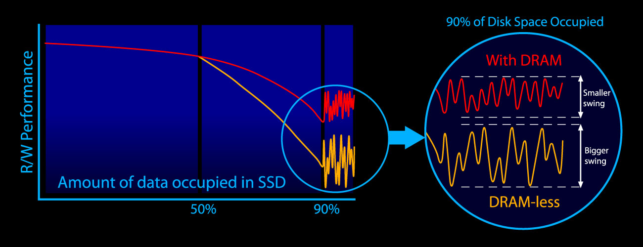 Твердотільні накопичувачі UD PRO SSD обладнані високошвидкісною кеш-пам'яттю DDR3L SDRAM і, таким чином не потребують додаткового резервування місця в основній пам'яті, що підвищує продуктивність при операціях випадкового читання / запису. Це робить доступною користувачеві всю ємність накопичувача. Крім того, зовнішній DRAM може бути буфером між контролером і спалахом. Крім того, зовнішній DRAM може бути буфером між контролером і пам'яттю NAND flash для забезпечення стабільної продуктивності при нестачі вільного місця на накопичувачі.