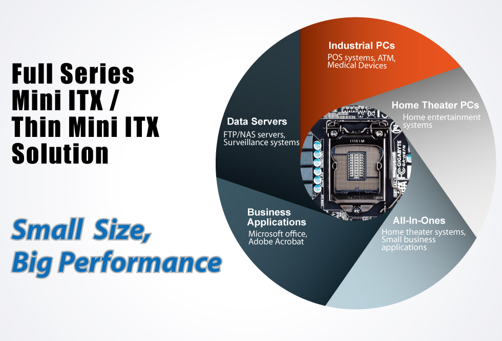 As the basis of a home theater or living room entertainment system, as a compact yet potent gaming machine, or even as a office PC that offers wireless digital signage options. GIGABYTE Mini ITX boards have the flexibility to meet the needs of your ever increasing digital lifestyle.