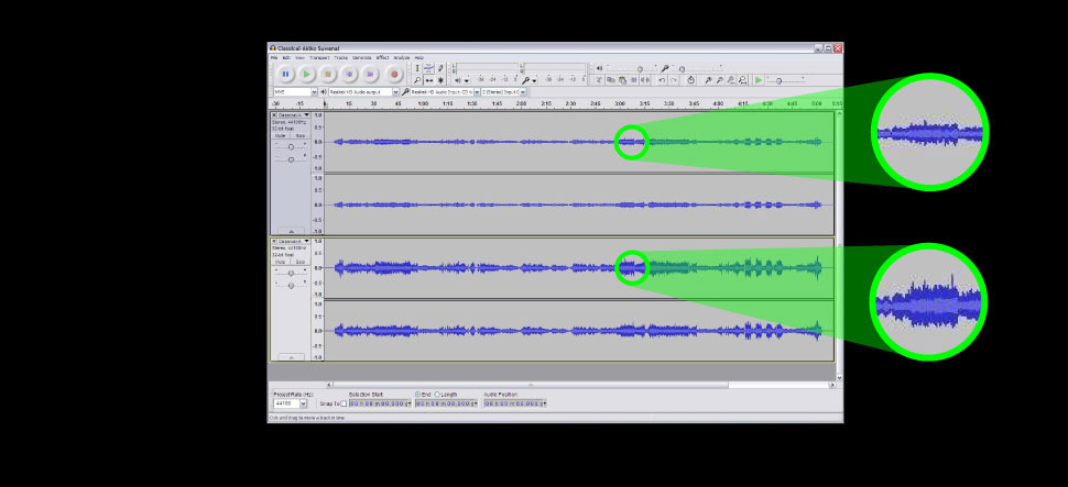 ![]() In order to demonstrate the difference in volume, clarity and punch that our exclusive upgradable Operational Amplifier delivers, we went to a professional recording studio and made comparison recordings. Here is a side by side example comparing the waveforms of a track by Akiko Sunwani. The lower wave form represents the recording made using an Operational Amplifier, the upper waveform using a traditional motherboard audio configuration. As you can see, there is a very tangible difference, with the OP Amp offering a much louder, clearer listening experience, with greater definition between lows and high throughout the track.. ![]() No OP AMP Sound Clip