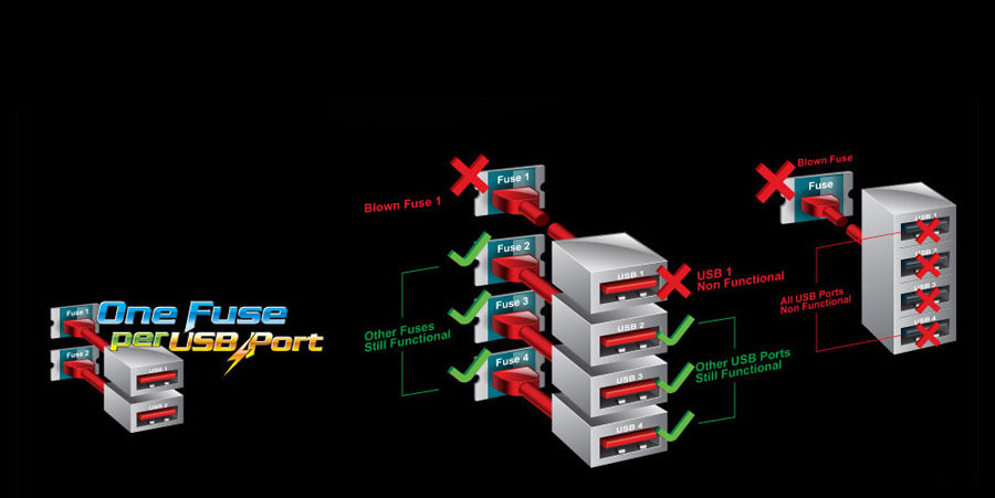 ![]() On GIGABYTE 8 Series motherboards each USB port has its own dedicated power fuse that prevents unwanted USB port failure, helping to safe guard your important data during transfer.