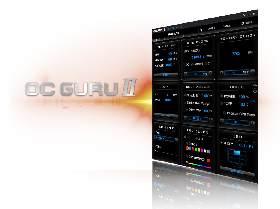 With extra color options and numerous lighting effects, you could now choose the right scheme for your gaming rig through OC GURU utility software.