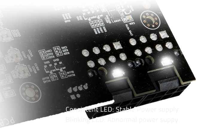 Be alert when PCI-E voltage is unstable with the smart power LED indicators. When experiencing any power abnormality, the indicator will alert gamers by flashing light. Abnormal power-related events will recorded in the system as well through OC GURU utility software as a useful reference for troubleshooting.