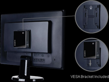 باستخدام حامل التثبيت المرفق VESA يمكنك بسهولة تعليق حاسب BRIX على ظهر الشاشة من الخلف أو التليفزيون و ذلك بشكل يجعله غير ظاهر أمام المشاهدين. هذا الأمر يحقق أيضاً وسيلة سهلة و فعالة لتحويل أى شاشة أو تليفزيون يدعم تركيب حامل التثبيت الخلفى VESA إلى حاسب شخصى متكامل أو وحدة عرض لافتات.
