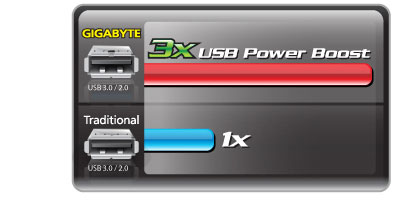 The 3x USB Power Boost from GIGABYTE is designed to deliver the utmost compatibility and stability for USB devices, such as external storage devices or optical drives, by supplying sufficient power through a single USB port. This will help free-up USB ports for using multiple USB devices on one motherboard. |