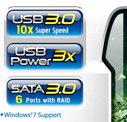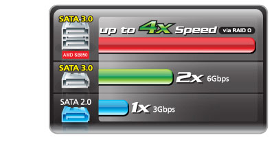 Double your hard disk drive performance with SATA Revision 3.0 (SATA 6Gbps) from AMD SB850, the latest generation of high speed storage interface with RAID 0,1,5,10 support. Coupled with RAID 0 (Stripe) mode, SATA Revision 3.0 enables a data transfer boost of up to 4x speed over SATA Revision 2.0. |