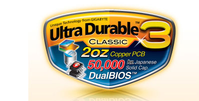 Revolutionary Ultra Durable™3 tech-nology from GIGABYTE features the industry’s first consumer desktop motherboard design with 2 oz copper Power and Ground layers for dramatically lower system tempera-ture, improved energy efficiency and enhanced stability for overclocking. |