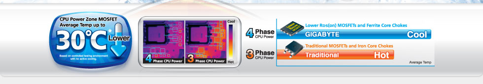 * Pour obtenir le meilleur comparatif thermique que possible, les ingénieurs de GIGABYTE ont comparé une carte mère traditionnelle ( 3 phases, bobines MOSFETs classiques ) avec une carte mère GIGABYTE Ultra Durable™ 2 proposant 4 phases d'alimentation, des bobines en ferrite et des MOSFETs à faible RDS(on). |