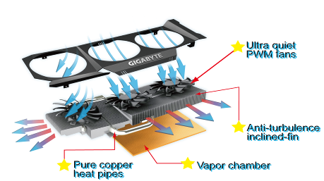 WINDFORCE™ 3X outward-inclined fan design is GIGABYTE’s innovative new generation triple-fan solution, which features 3 ultra quiet PWM fans, two 8mm copper heat pipes and a king-size (140x86 mm) vapor chamber to maximize the speed of heat dissipation.