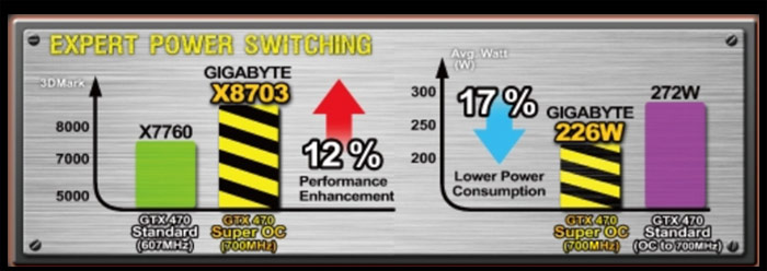 • A GIGAYBTE GTX 470 Super OC Edition graphics card delivers a 12% increase in performance compared to a standard GTX 470 card.