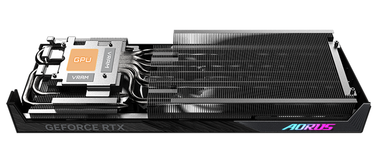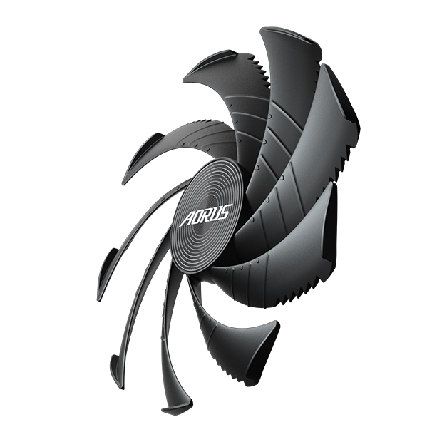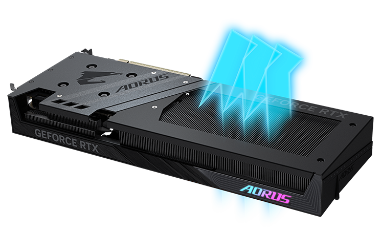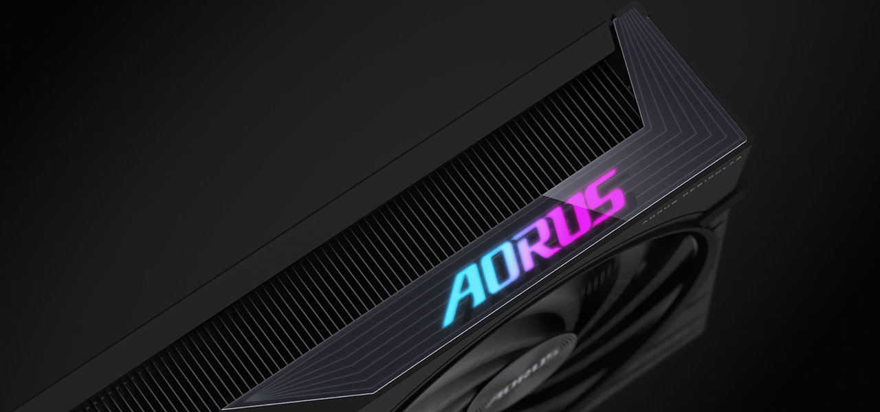 The AORUS logo on the side utilizes an overlay design to create a gradient effect, enriching the visual layers while also presenting a dynamic and vibrant aesthetic.