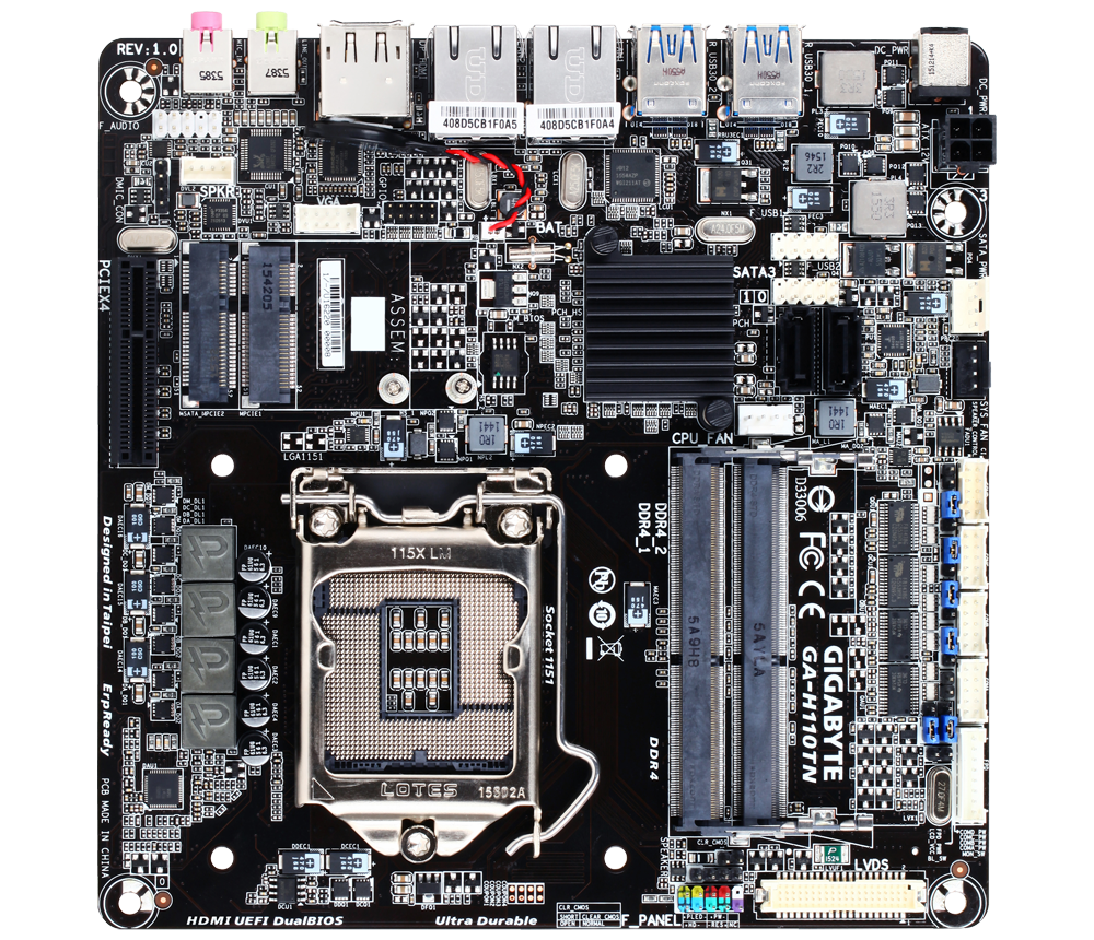 GIGABYTE H110 Mini-ITX motherboards support the latest 7th/ 6th Generation Intel® Core™ processors, a 14nm desktop CPU which features improved performance, power efficiency and support for DDR4 memory, bringing cutting edge features and ultimate performance to your next PC build. Offering an All-in-One, small form factor and slim profile PC experience, GIGABYTE H110 Mini-ITX motherboards are 43% thinner than traditional Mini-ITX designs. Complying with the latest Mini-ITX guidelines, GIGABYTE motherboards offer additional flexibility making them suited to broad range of innovative PC designs.
