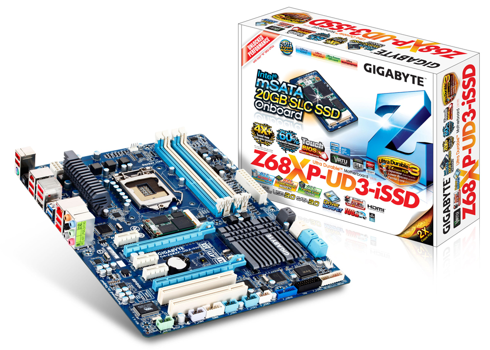 Z68XP-UD3-iSSD motherboard based on the Intel® Z68 Express chipset and pre-bundled with the 20GB Intel® Solid-State Drive 311 Series. The included mSATA-based single level cell (SLC) solid-state drive (SSD), allows users to take advantage of the performance benefits of Intel® Smart Response Technology straight out of the box.GIGABYTE Z68 motherboards are equipped with the much anticipated Intel® Smart Response Technology, allowing users to experience system performance similar to SSD-only systems. Intel® Smart Response technology works by using intelligent block-based caching of frequently used applications to improve system performance and responsiveness. In fact, GIGABYTE Z68 motherboards with Intel® Smart Response Technology are able to outperform hybrid drive systems by more than 2X (PC Mark Vantage HDD test) and HDD-only systems by as much as 4X (PC Mark Vantage HDD test) and deliver a 60% performance improvement over HDD-only systems in PC Mark Vantage Suite.