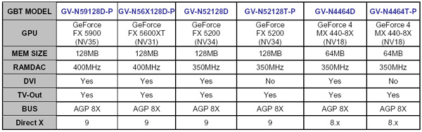 Gigabyte graphics accelerators based on the NVIDIA GeForce FX 5900, GeForce FX5600,GeForce FX5200 and GeForce MX 440-8X series of graphics accelerators are expected to be available by early November worldwide. The Gigabyte product range is as follows:
