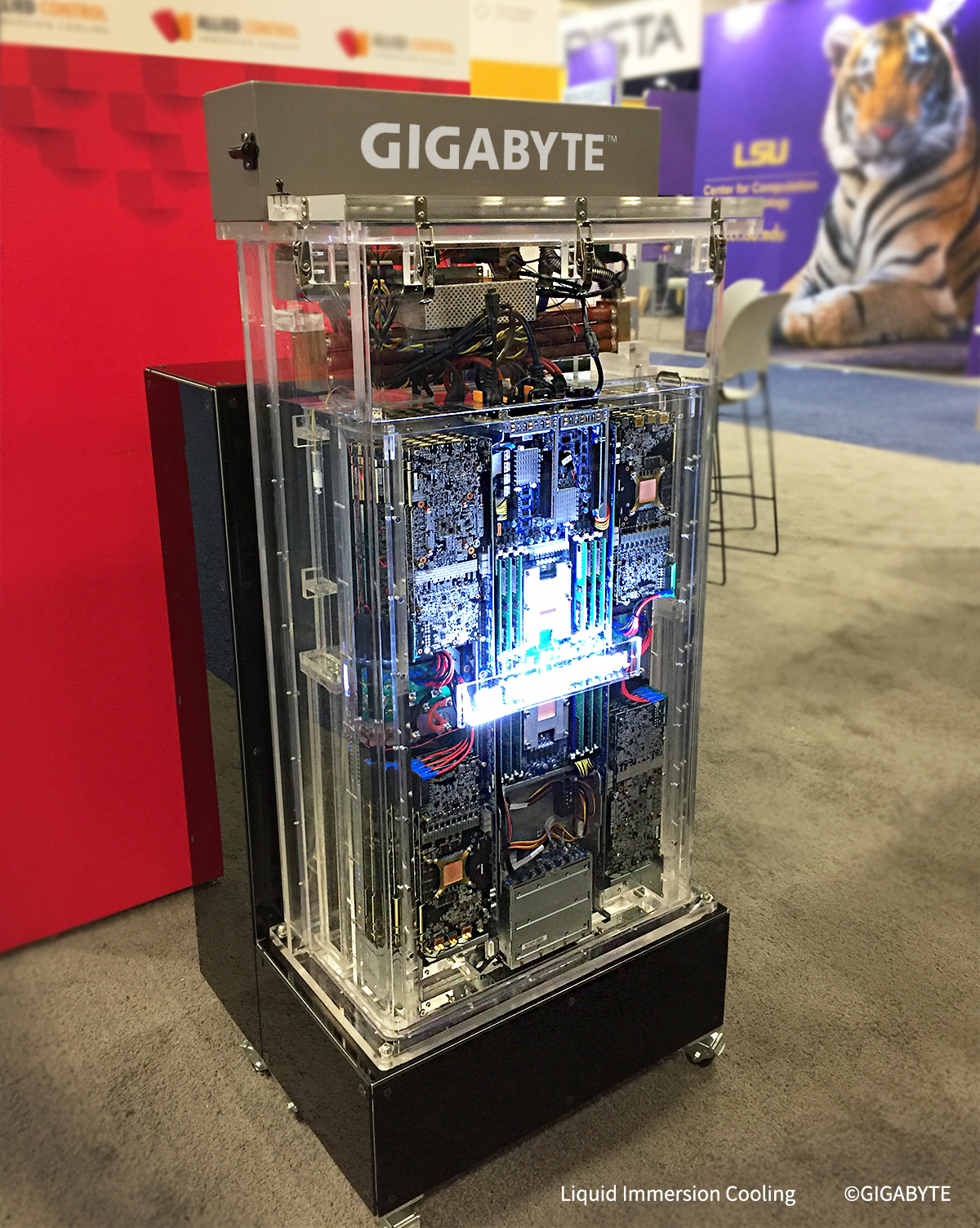 Smarter future requires high density computing, and it often faces the challenge of heat dissipation. GIGABYTE wowed CES with a fully-submerged system that breaks the physical limitations of traditional air cooling system and effectively cools heat created by the hyper-processing computers to a sustained condition. This year GIGABYTE introduces the next generation of the Two-Phase Liquid Immersion Cooling System, featuring a standardized proof of concept unit that is immediately available to purchase. Through continuous improvement, this new generation is able to provide double the amount of floating point operations performance and achieve even better PUE in an even more compact physical size, presents an enhanced solutions to the ever-increasing computation demands.