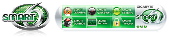 GIGABYTE Smart 6™ is designed with user-friendliness in mind, offering a combination of 6 innovative software utilities that provides an easier and smarter way for managing your system. Smart 6™ allows you to speed up your system performance, boot-up time, managing a secured platform or recovers your system easily with a click of mouse button.