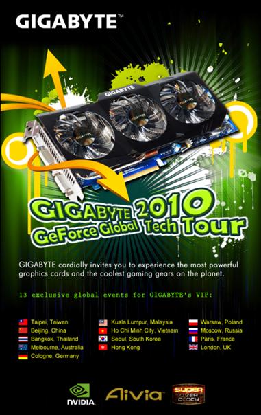 Taipei, Taiwan, August 16th, 2010 – GIGABYTE, a leading manufacturer of motherboards and graphics cards, is pleased to announce its first graphics card and peripheral oriented global tech tour. Together with NVIDIA, GIGABYTE will host 13 exclusive global events at various local venues from the second week of August to the last week of September, to promote the ultimate 400 Series from GeForce GPU’s.